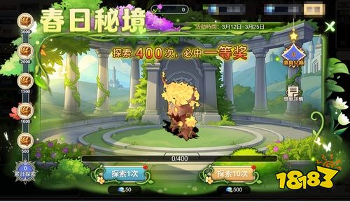 活动期间将敞开“春日秘境”抽奖玩法,玩家可通过抽奖获得各类稀有道具。当抽取次数到达指定条件后,可获得本期全新宠物“千叶神树”、橙色符文随机包与很多翡翠树叶等奢华奖赏。此外,玩家耗费少量的翡翠树叶后亦可于活动商铺直接兑换“千叶神树”。翡翠树叶一起也可用于兑换限制头饰与橙色宠物配备自选箱等丰厚奖赏。